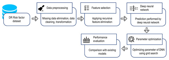 Figure 1 shows the proposed DNN model to predict DR diagnosis from several risk factors, based on a public DR dataset. Data pre-processing removed inappropriate and inconsistent data. During the pre-processing stage, data normalization was applied by rescaling real valued numeric attributes into [0, 1]. Missing values in the numeric and nominal attributes were replaced by mean and mode, respectively. Then RFE removed irrelevant features, and a DNN-based prediction was developed using the grid search algorithm to optimize the model hyperparameter and, hence, maximize DNN performance. Performance was evaluated by comparing the proposed and other best-practice machine learning models from previous studies.