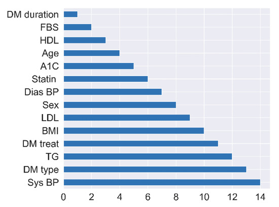 Figure 3 shows the attribute ranking for the DR dataset. We investigated the impact of the top k features for DNN accuracy. The SVM-RFE was executed to remove irrelevant features, and important features (k) are utilized as the input for the DNN. This process is repeated for all possible k features. Finally, we found that the first (top) 13 DR features is the optimal number of features that can maximize DNN accuracy. Hence only systolic blood pressure (Sys BP) was removed from the DR dataset. Section 4.2 discusses optimizing the number of features for the dataset.
