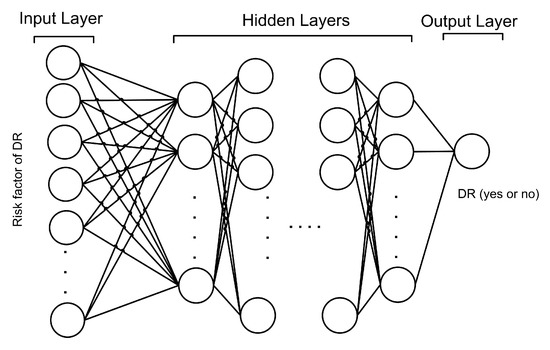 We employed a DNN model to predict DR from the risk factors dataset. A DNN is an ANN class with multiple hidden layers between input and output layers and has recently become highly successful for classification. A DNN is fully connected; hence, each unit receives connections from all units in the previous layer. Thus, each unit has its own bias and a weight for every pair of units in two consecutive layers. The net input was calculated by multiplying each input with its corresponding weight and then summing. Each unit in the hidden layer took the net input and applied an activation function. Thus, network computation with three hidden layers can be expressed as