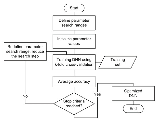 We utilized the grid search algorithm [44] to automatically select the best parameters for the proposed deep neural network (DNN) model. We then applied a grid search for the training set and measured cross-validation to obtain the best prediction model, as shown in Figure 5. The objective for this method was to select the best hyperparameter for the proposed DNN model to achieve the highest accuracy for DR. We found a five-hidden-layers network with different neurons each, ReLU as activation function, and SGD as weight optimization were the best parameters for the DNN. Table 3 shows optimized hyperparameter details for the proposed DNN for DR. Finally, we applied these parameters to the proposed DNN model.