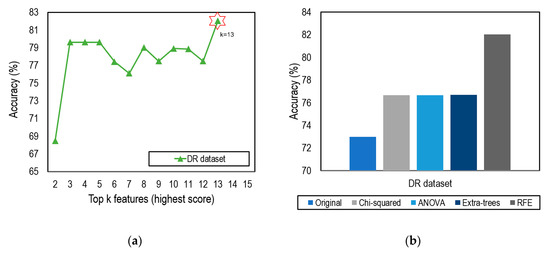 The optimal number of features is required to implement RFE. Therefore, we investigated the impact of top k features on DNN accuracy. The full dataset included 14 features, and RFE expected to remove irrelevant features. Figure 7a shows the impact of the best k features as defined by RFE on DNN model accuracy. Optimal, k = 13 for DR dataset, and maximum DNN model accuracy are achieved when including only these defined optimal features. The result showed that removing high number of features leads to the reduction of accuracy; therefore, the highest accuracy can be achieved by removing a small number of features.