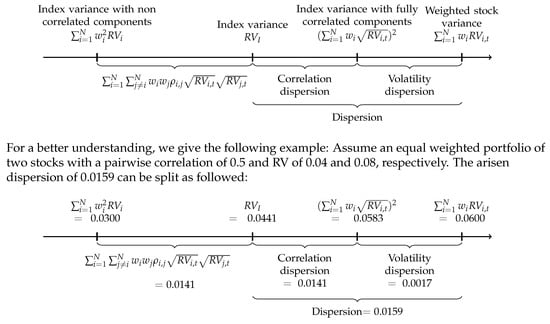The first term represents the variance dispersion of the single index constituents. This component is independent of the individual correlations. However, the second expression depends on realized correlations and describes the spread between the index variance under perfectly positively correlated index members and the realized correlations. Therefore, dispersion trades are exposed to volatility and correlation. This is reasonable as the variance of the index is eventually a function of the realized correlations between index members and their variances. Reference [24] already quantified this relationship in 1952: