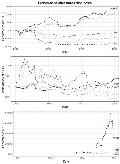 Development of an investment of 1 USD in PSD, PSU, LSD, and LSU after transaction costs compared to the S&P 500 (MKT). The time period is divided intro three sub-periods from January 2000–December 2005, January 2006–December 2011, and January 2012–December 2017. Source: authors’ calculations.