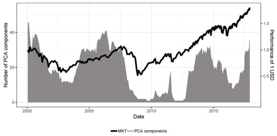 Number of required principal components to explain 90% of S&P 500 constituents return variation and S&P 500 index performance (MKT) from January 2000–December 2017. Source: authors’ calculations.