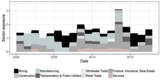 Last, but not least, Figure 5 shows the yearly sector exposure based on our PCA selection process from January 2000 to December 2017. In line with the Standard Industrial Classification, all companies are categorized into the following nine economic sectors: “Mining”, “Manufacturing”, “Wholesale Trade”, “Finance, Insurance, Real Estate”, “Construction”, “Transportation and Public Utilities”, “Real Trade”, “Services”. Each point on the horizontal axis refers to the sectors that are used in the year after to the respective point. First of all, we observe that the sum of positive sector exposures increases in times of high market turmoil. Especially, the cumulative value exceeds three in 2013 because of a high exposure in “Finance, Insurance, Real Estate”, especially for Bank of America Corporation and Goldman Sachs Group, Inc. Furthermore, the exposure of each sector varies over time, i.e., industry branches are preferred and avoided in times of bull and bear markets. As such, the percentage of financial stocks increases in 2009 and 2013, the peak of the global financial and European debt crisis.