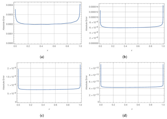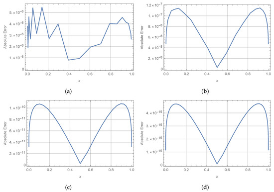 Plots of the absolute error of y(x) or Example 1 using the sinc-derivative interpolation for various values of N. (a) N = 10; (b) N = 15; (c) N = 25; (d) N = 40.