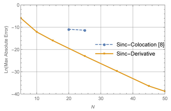 The logarithm plot of the maximum error as a function of the number of sinc nodes N using the current method and that of [24] is shown in Figure 3. For the result of [24], only the portion of the graph that was reported in their paper is displayed. The plot shows the exponential decrease of the errors with respect to N and confirms that the sinc-derivative approach is a highly accurate method for solving IDBVPs.