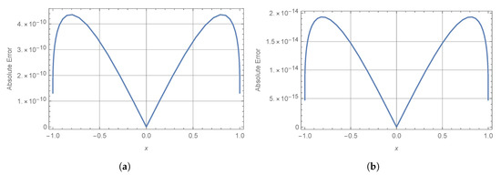 The plot of the absolute errors of the sinc-derivative solution for Example 2. is depicted in Figure 4. for and . The maximum absolute errors are for and for . The best result presented in [46] has a maximum absolute error of . Hence the present method performs extremely well.