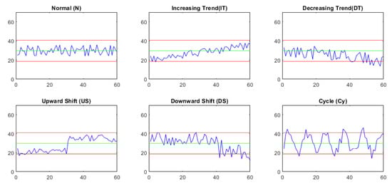 Multivariate control techniques, in general, allow us to analyse process-related variables. Likewise, these techniques make it easy to make out the relationship between those variables and, also, provide graphs of variable behaviour. However, multivariate techniques have proven to carry inherent drawbacks that, ultimately, limit their flawless application within the industry. Among those drawbacks, there is the complexity of the calculations, the fact that they only seem to detect out-of-control signals, that they do not indicate the reason behind failure, and, lastly, that they do not provide adequate tools to determine the underlying issues that rise to the out-of-control signals. In addition, the operator needs to have the knowledge of multivariate statistical control to understand and interpret results [1,5]. Statistical process control techniques are tools limited to automate industries with a large number of elements to monitor [5,6]. Univariate control charts have been studied since 1929 and were developed by Dr. Walter A. Shewhart. These graphs are a horizontal diagram that displays the points (measurements) on a timeline and assumes that if the data generating process maintains a state in statistical control, then the points will have a visible random pattern; this random pattern is related to the normal distribution shape. In addition, these graphs display three lines parallel to each other and to the horizontal axis of the graph: limit lines and center line. The limit lines called upper and lower control limits are obtained at a distance of from the mean when the process remains stable and the central line corresponds to the mean value. The pattern that demonstrates stability in the process is the natural one and, when its stability is broken due to the presence of some disturbance in the process, the stable state of the process is lost indicating instability or loss of control in the process. The patterns associated with stability and instability are strongly related to two types of statistical variability. This article considers two types of variability: special variation and natural variation, which correspond to unstable and stable cases, respectively. These variations can be discerned in the distribution of measurements corresponding to a certain variable with respect to a unit (time, sample number, space, data series). The distribution or shape of the measurements are identified as special patterns and natural patterns [7]. The basic patterns for variable-behaviour identification and retrieval of potential causes are specified in the Western Electric Manual [8]. The basic patterns have been defined as Increasing Trend (IT), Decreasing Trend (DT), Downward Shift (DS), Upward Shift (US), Mixed (M), Cycle (Cy), Systematic (S) and Normal (N).