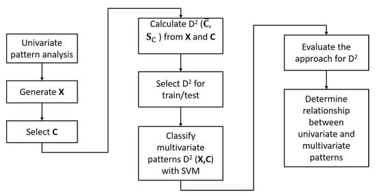 In this paper, a method to recognise univariate patterns in multivariate patterns using the Mahalanobis distance has been shown. The method determines the association of multivariate patterns with univariate variables. During experiments, multivariate patterns formed by Mahalanobis distances were calculated with different multivariate variables. When visually inspecting the types of multivariate patterns as observed in the 36 classes of , no distinctive forms were found for each type of multivariate pattern compared to the characteristic forms presented by the univariate patterns of the “Synthetic Control Chart Time Series”. This was our main motivation for interchangeably analysing , and cases and their differences using the Mahalanobis distance through SVM recognition.