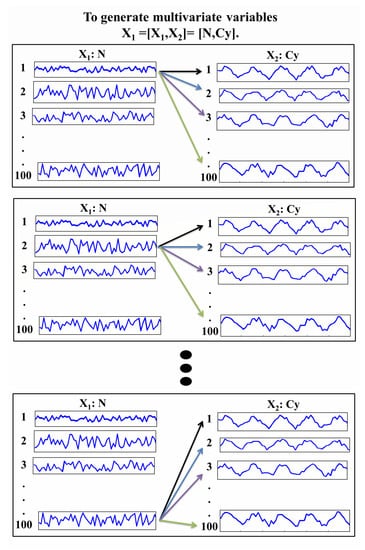 The proposed method considers p-variables of a random process defined as a multivariate variable. In this form, is defined as a multivariate variable formed by p univariate variables. In this paper, we present the approach with univariate variables so that the composition of each multivariate variable is . Table 1 shows the configuration of these multivariate classes. To determine the quantity of multivariate variable types, the permutation formula applied is: ; where n = types of patterns to choose from and r = number of elements that forms the permutation. The procedure consisted in choosing 100 samples containing a type of pattern for and another 100 samples for and combining them to form a type of multivariate variable as shown in Figure 3. Based on the above, 10,000 multivariate variable samples were generated for each of the 36 classes of multivariate variables shown in Table 1, making a total of 360,000 sample patterns as population study.