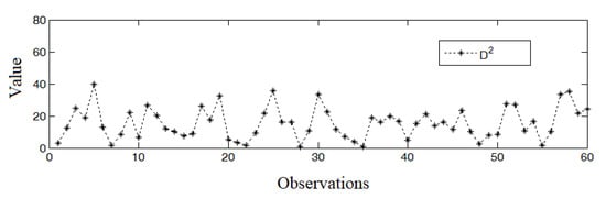 As an example, consider , which is constituted by two univariate variables with cyclic patterns . The Mahalanobis distance is then calculated between the observations of the multivariate variable and of the multivariate variable . These values are shown in Figure 4.