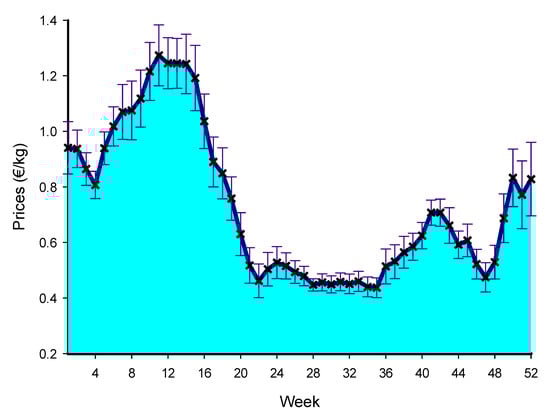 Mid-May (week 16) is the start of the harvest of peppers cultivated in the Murcia region under thermal greenhouse covering. This means that two or three weeks in advance of the period they would be harvested without thermal covering. The mean price for this week was 1.04 €/kg with a standard error of 0.10 €/kg. This volatility is transmitted along food supply chains thereby exposing all chain actors to risk and uncertainty [71]. The price trend is clearly decreasing until it drops to prices around 0.45 €/kg, where it stabilizes until almost the end of the campaign (Figure 1).