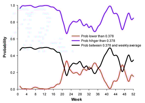 Due to weekly fluctuations, the weekly price is considered a normal variable, with the corresponding mean and standard deviation for each week. Weekly analysis is normally used for this kind of horticultural crop [72]. Figure 2 shows the weekly probability that the price will be higher than the corresponding price at threshold profitability, that it will be lower than this threshold, or that it will be between threshold profitability, and the mean price of the week in question.