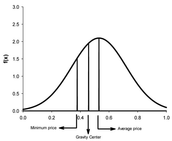 Figure 3 shows the situation for week 24, which has been taken as an example. The mean price for this week is 0.53 € kg−1. There is a risk of a temporary fall in prices down to threshold profitability (0.378 € kg−1). In accordance with (13), the center of gravity has been obtained from part of the curve between 0.378 and 0.53 € kg−1, obtaining a value of 0.458 € kg−1. In this way, we can summarize all the prices in this range into a single price, 0.458 €/kg. For this price, the loss is 0.07 € kg−1. In addition, the probability of the price being between 0.378 and 0.53 € kg−1 is 0.31. Consequently, the product of loss through its probability permits obtaining risk as a percentage, which multiplied by mean production of the given week (12.473 € kg−1) involves a risk of EUR 122.36 (Table 2) for the given week. This methodology has also been used for the analysis of investments in the energy sector, where Espinoza and Rojo [73] study the variation of solar radiation.