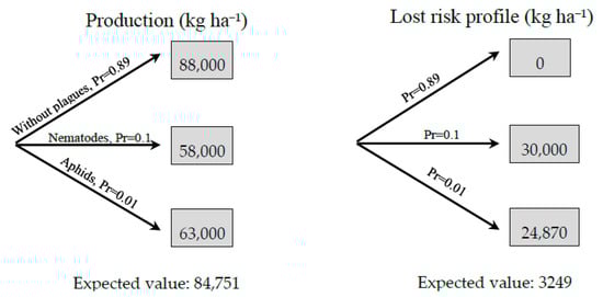 Figure 4 summarizes the previous information. Production with each type of pest is indicated with their occurrence probability, and the loss risk profile obtained as base production (88,000 kg ha−1) minus production for each case. For nematode risk, the loss risk profile is 30,000 kg ha−1, being the difference between 88,000 kg ha−1 and production obtained without treatment (58,000 kg ha−1). Espinoza and Rojo [73] make a similar analysis to evaluate the tariff risk profile in renewable energies.