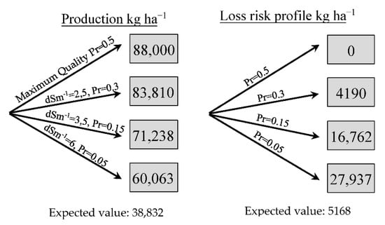 Loss due to salinity has been obtained from the consulted biography [32]. Three levels of salinity in water have been determined, with each one permitting a different production and consequently a loss, which becomes greater according to the increase in salinity of the water. There are different studies that establish three levels of salinity; for example, Cámara-Zapata et al. [75] carried out a study on the profitability of tomatoes. Given that the quality of the water is not an option for the grower, an occurrence probability for each of the scenarios is considered in accordance with the information gathered from the growers, and a loss of EUR 0.90, 1.80 and 1, respectively, is obtained, which is a total of 3.7% and is 5.87% with respect to control production (Table 5 and Figure 5). Other similar applications can be found in Espinoza and Rojo [73].