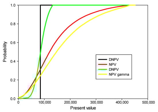With respect to the comparison between methodologies, it should be noted that the use of DNPV is much more accurate because it enables quantification of the risks while NPV is limited to increasing the discounting rate. The use of decreasing discount functions helps to partly mitigate the strong impact from the increase in interests on the discounted cash flows over time. This use of these decreasing functions only slightly affects the results obtained in DNPV, while it is more pronounced in traditional NPV, because it uses higher interest rates and therefore penalizes future cash flows more.