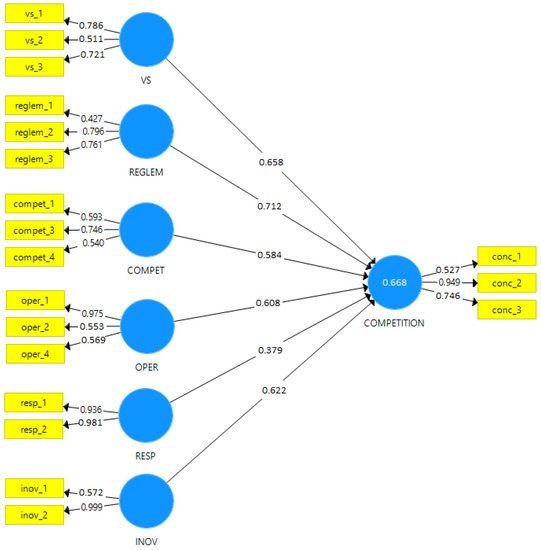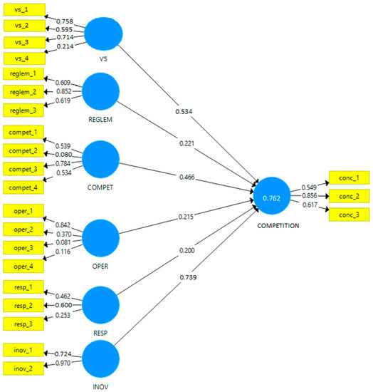 Chin [66] considers that the constructs for which the coefficient values are less than 0.5 should be excluded from the measurement model. As a consequence, from the model we will exclude the variables: vs_4, compet_2, oper_3, and resp_3. After these variables were removed from the model, using the SEM-PLS equations and using the SmartPLS 3.2.8 software, we obtained the second measurement model.