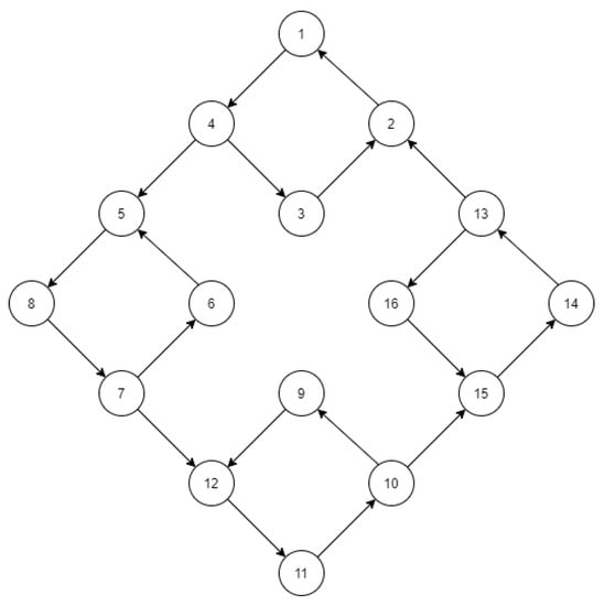 Consider model (7) and its solutions on . Let the number of agents N be equal to 16, and the topology of connections between them be as on Figure 1. Despite that we choose N to be not quite large, its quantized state space appears to be of significant dimensionality, as it will be shown below. Such a state space may undoubtedly include a much larger amount of agents. However, after the cluster synchronization, they would occupy a relatively small zone (thus making the state space sparse), whether there are 16 or 1000 agents. With that being said, in the current work, we focus on a simple example just to demonstrate the main features of our approach.