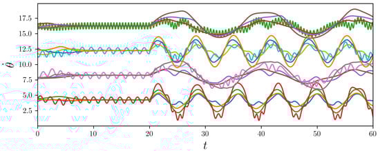 Trajectories of Equation (7) with sinusoidal and significant differences between from different components of the communication graph: the clusters are “flowing” over time.