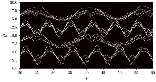 Assuming that the initial phases are uniformly distributed on a circle , in the absence of any mesoscopic control () and given that the outputs coincide with , the described configuration leads to cluster synchronization with a partition consisting of four subsets of agents. In other words, we obtain -synchronized clusters for some values and , such that , which are analyzed in [32]. However, in this work, we focus on non-trivial “flowing” cluster patterns, which emerge after adding a sinusoidal control function at , i.e., when -synchronization visually estabilish: