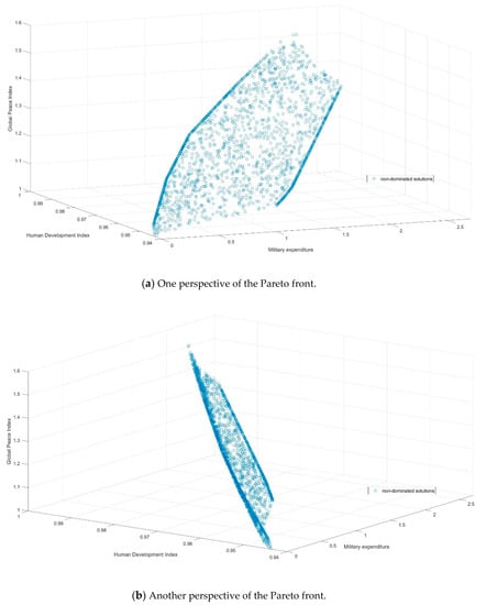 Several researchers have examined the relationship between MEs and economic growth [,,]. [] concluded that most of the models applied were ad hoc and lacked well-defined economic bases. In this context, [] proposed a model to address the shortcoming noted by [] with a fundamental two-sector model for examination of the effect of exportation on economic growth. According to [], the study of MEs in developing countries focuses on fundamental questions related to development and growth, government, and security, which are difficult to quantify and model properly. They divide theoretical models of the relationship between MEs and growth into three sets: those analyzing the roles of offer and demand in capital gain (Keynesian), those that highlight positive or negative externalities, and those that emphasize that security is a public property. Empirical models have been established based on a single equation estimated using the ordinary least-squares method. However, a single equation cannot encompass the multiple and complex interrelationship of MEs with the economy. As defense and economic growth are related to security and development, theoretical models should encompass the broad context of the socioeconomic situation and yield multivariable explanations. Recently, [,] revised this multivariable relationship using countries panels between 1992–2006, 1998–2012, and 1970–2014. Hence, we propose that relationships among the objectives MEs, security, and development be analyzed simultaneously to answer the first question mentioned. This goal requires the use of a methodology that facilitates understanding of the combination of these objectives during decision making, such as multicriteria decision-making analysis. Multiobjective programming enables work with several objectives in a feasible region with the aim of determining their Pareto front []. The action plan for the countries, considering the given objectives, is far from being homogeneous, because of different intrinsic aspects related to each country: political, economic, social, cultural… For this reason, one of the best methods to embrace all these action disparities and to analyze a simultaneous study of the different performances is multiobjective programming, which enables the determination of efficient behaviors. In this context, the proposed model is one of the major contributions of our work, from a methodological point of view, as well as its utility in economy, politics, and social improvement.