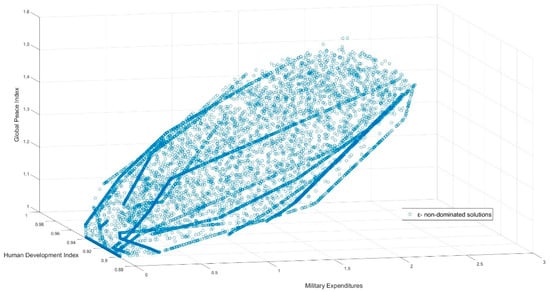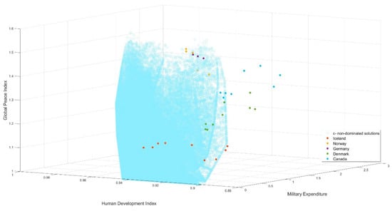 Minimum ME values approach the ε-Pareto front, differing only by 0.01. The minimum HDI value (0.71) is less than the ε-Pareto front (0.89), suggesting that countries with lower values might increase their HDIs. The minimum GPI value (1.10) is greater than the ε-Pareto front (1.0), suggesting that countries might improve conditions by reducing their GPIs (Figure 3).