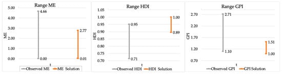 These results indicate that the ME values of the efficient solutions promote a relief over the budget of the state, as it demands less use of resources for the military sector and allocation of liberated resources to other sectors. In case of the HDI, its narrowed variation range implies a reduction in differences in the level of human development among countries. For the GPI, the narrow range shows the possibility of reducing the dispersion of countries’ peace conditions.