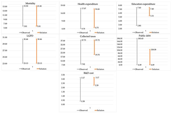 Figure 5 shows the lack of homogeneity between the behaviors of the ε-efficient solutions and the sample values. Mortality and GDP-related variables show the same ranges of variation. Other variation ranges are narrower for the ε-efficient solutions than observed; observed and frontier values for education expenditures, taxes, and R&D costs are the largest.