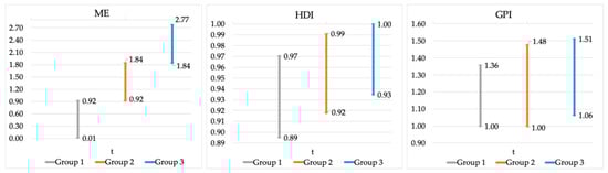 To provide coherence with these analytical findings, a similar analysis was performed for the GPI. It yielded similar results, with ε-efficient frontier ranges coinciding with the previous analyzed case, except for healthcare expenditures and the GDP, which move upward as the GPI increases. Finally, the HDI does not vary significantly among groups, whereas ME values are the worst, with the exclusion of the best values as the GPI increases.