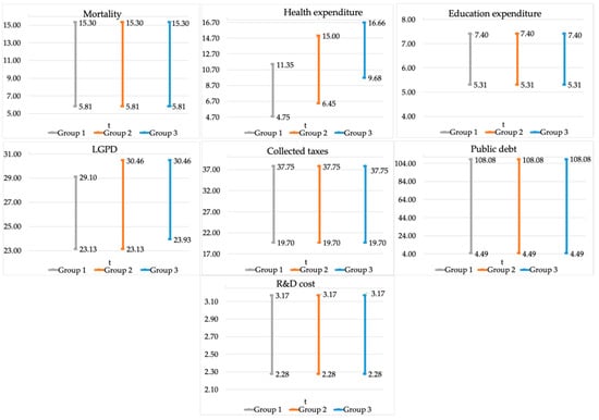 In group 2, better HDI results might be obtained at the expense of the GPI, relative to group 1. Nevertheless, the variation ranges for decision variables that determine these objective function values are maintained, except those for health expenditures and the GDP.