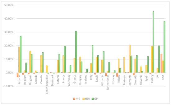Figure 8 suggests a direction of improvement, starting from the current performance of each country, and several changes should be made in order to get closer to the efficient nearest solution. The figure represents how much each country could be improved, in percentage, for every objective if they reach the ε-efficient closest solution. For instance, in the case of Turkey, its ε-efficient closest solution shows a minimum increase in ME, whereas it needs to improve by around 20% for the HDI objective and around 45% for the GPI objective. In this context, observe the situation of countries such as Denmark and Norway, whose changes are, almost, insignificant to reach their ε-efficient closest solution. Hence, the improvement would be minimum in these countries, as they are already close to the ε-Pareto front (see Figure 4).