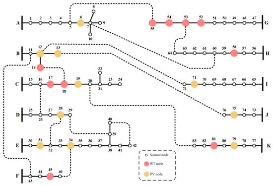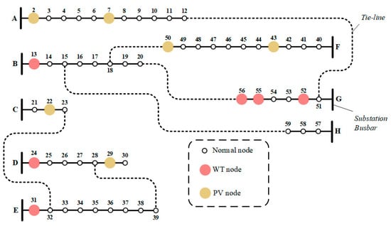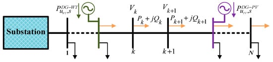In this section, the power flow equations, the graphically based DNR mathematical algorithm, load, WT, PV DGs’ models, TOPSIS, and system performance indices are illustrated in detail. Figure 1 demonstrates distribution network modeling for the upcoming case studies.