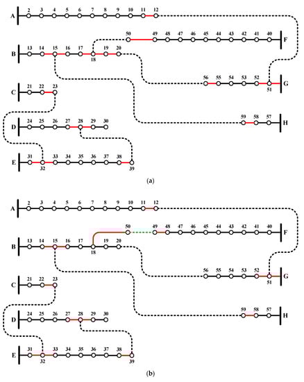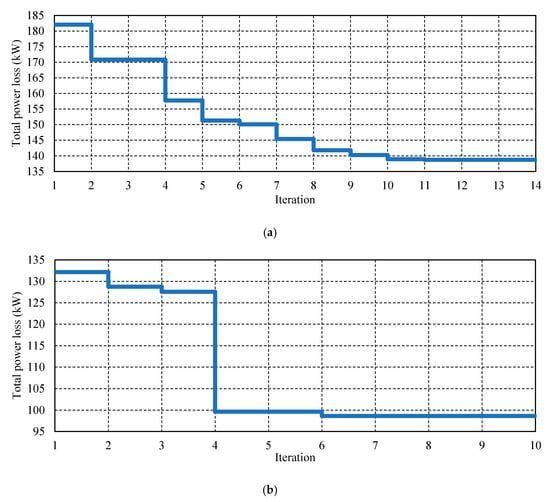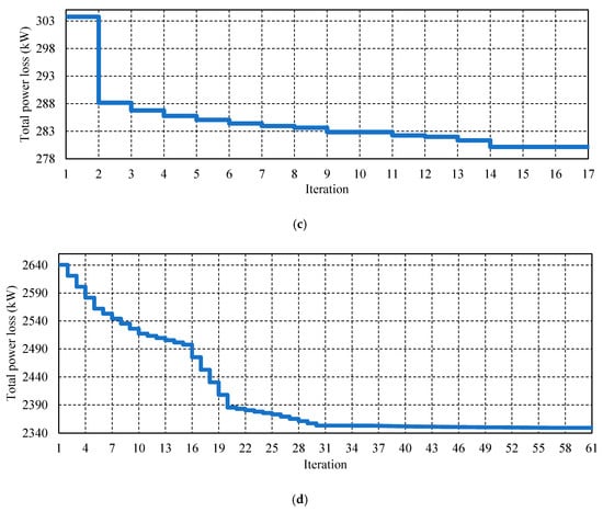 Recently, in 2019, a novel graphically based DNR mathematical algorithm [18] was proposed by the authors to find a near-global/global positioning of tie-lines for large distribution networks. It has proven its ability to find near-global solutions in a short computational time for large distribution networks up to the 4400-node distribution network. The reconfiguration procedure takes place by exchanging the status of the existing tie-lines of the best configuration () obtained with their neighboring sectionalized lines, after being prioritized by an efficient index called weighted voltage deviation index () to obtain many temporary configurations (), which are further checked for optimality. Furthermore, this DNR mathematical algorithm has proven its ability to reconfigure the distribution networks without the need for a radiality check, and unlike the other heuristic optimizers, it does not depend on any random generations. The reader can refer to the details of this methodology in Reference [18]. The MATLAB code used to reconfigure the 59-node distribution network is provided in Reference [26], in which the MATPOWER [27,28] toolbox is used for the power flow solution. Figure 2a–c illustrates the status exchange procedure between the tie-lines (dotted lines) and their neighboring sectionalized lines (highlighted in red) to obtain a better loss minimization. In the first iteration, as shown in Figure 3b, the tie line connecting the nodes 18 and 50 is changed to sectionalized (highlighted in red), and the sectionalized line joining nodes 49 and 50 is changed to a tie-line (highlighted in green) to obtain a better configuration that provides a minimum power loss than that in the initial configuration. The convergence curves for power loss minimization using this DNR method are shown in Figure 3 for the 59-, 69-, 135-, and 415-node distribution networks [18], where they reached the optimal fitness at the 11th, 6th, 14th, and 55th iteration, respectively.