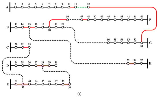 Reconfiguration process for the 59-node distribution network: (a) Initial configuration, (b) 1st iteration configuration, and (c) 2nd iteration configuration.