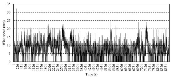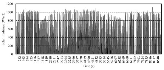 In this work, the wind speed, the solar irradiance, and the load data are available in Reference [31]. These data are applied to the studied distribution networks to imitate the uncertainty effect on HC maximization. The solar irradiance, wind speed, and load profiles for one year are provided in Figure 4, Figure 5 and Figure 6, respectively. The 8760 hourly data are reduced to relevant 30 scenarios using the backward reduction technique developed by Growe-Kuska et al. for stochastic programming [32]. The obtained scenarios, including loading level (), wind speed, solar irradiance, and their probabilities (), are provided in Table 1 for each scenario (s). It is well noted that increasing the number of scenarios will increase the accuracy of the obtained results; however, conducting the optimization procedure based on 30 scenarios is relevant from the practical perspective [30].