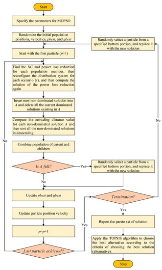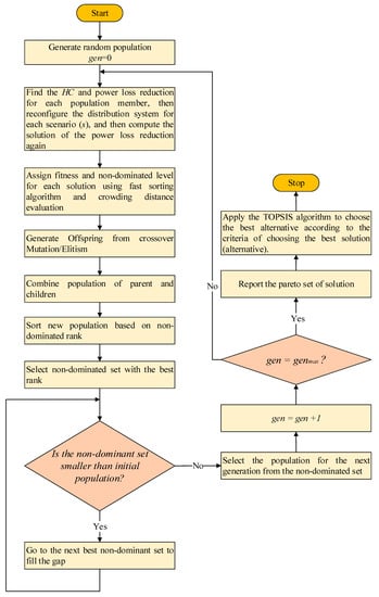 In this work, five distribution networks, 16-, 59-, 69, 83-, and 415- node distribution networks are used [39,40,41,42]. The 415-node distribution network is a large distribution network, composed of five instances of the 83-node real distribution network to mimic the complexity of large real distribution networks. The schematic diagrams of the 59- and 83-node distribution networks are provided in Figure 7 and Figure 8. The input data used for the upcoming case study is supplied in Table 2 and Table 3. In this work, two multi-objective optimization approaches are employed to solve the upper multi-objective nonlinear optimization problem, including non-dominated sorting genetic algorithm (NSGA-II) [24] and the multi-objective particle swarm optimization (MOPSO) [25]. NSGA-II is one of the most well-known multi-objective optimizers. It was developed by Deb et al. in 2002 as an improvement for the genetic algorithm to handle multi-objective optimization problems via several characteristics in its code, including fast non-dominated sorting and crowded distance estimation. The reader is referred to Reference [24] for more details about this multi-objective optimization algorithm. In the particle swarm optimization algorithm, each solution is known by its position and velocity, where the best solution of the particles at a certain iteration is denoted by pbest, and the global solution obtained till the current iteration is denoted by gbest. A further extension was conducted in Reference [25] to handle multi-objective optimization problems. The reader is referred to Reference [25] for more details about MOPSO. The flowcharts of the NSGA-II and MOPSO are shown in Figure 9 and Figure 10. Furthermore, the DNR mathematical algorithm in Reference [18] used to reconfigure the studied distribution networks in the lower-level optimization problem. The following case study is conducted on MATLAB r2018a on a DELL Laptop, its model name is ‘Latitude E7450′, including an ‘Intel® Core™ i5′ CPU at 2.3 GHz, and 8 GB RAM.