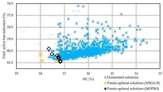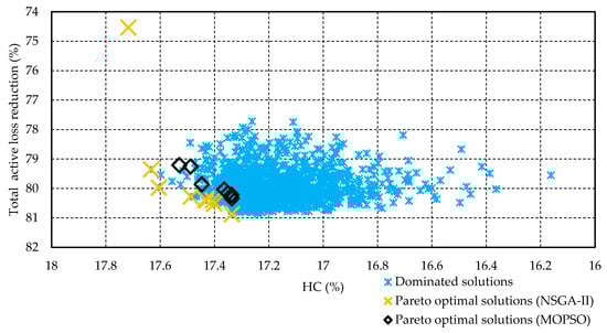 In this work, a multi-objective bilevel optimization approach is employed to assess the maximum HC and also maximize the total power loss reduction of six distribution networks up to the 880-node large distribution network. The optimization process is conducted by setting two optimization levels, i.e., the upper and the lower levels, to address the planning, and operation viewpoints, simultaneously. In the upper level, two multi-objective optimization techniques, including multi-objective non-dominated sorting genetic algorithm (NSGA-II) [24] and multi-objective particle swarm optimization (MOPSO) [25] are employed to maximize two objectives, including HC maximization of the distribution networks and maximization of the total power loss reduction. In the lower level, the graphically based DNR algorithm in Reference [18] takes place to maximize the power loss reduction of the distribution network at each scenario.