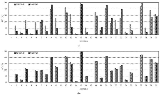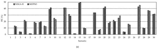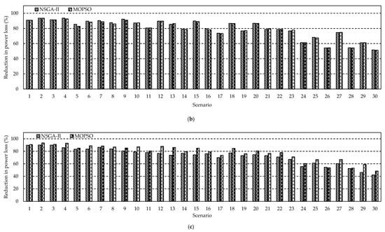In this work, the WT and PV DGs are allocated at a certain set of nodes due to land space limitations. These PV/WT nodes are provided in Table 4. The is assessed for the 16-, 59-, 69-, 83-, and 415-node distribution networks at different scenarios of wind speeds, solar irradiance, and load uncertainties, as shown in Table 5. The pareto-front of the obtained results for the 83- and 415-node distribution networks are provided in Figure 11 and Figure 12, respectively. The WT and PV DGs sizes in MW at each node using NSGA-II and MOPSO, are provided in Table 6 and Table 7, respectively. Besides, the configurations of the 16-, 59-, 69-, 83, and 415-node distribution networks at each scenario are provided in Table 8, Table 9, Table 10, Table 11 and Table 12, respectively. The HC and power loss reduction are provided in Figure 13 and Figure 14, respectively, for the 59-, 83-, and 415-node distribution networks at each scenario. Finally, the voltage profiles at multiple scenarios for the 59-and 83-node distribution networks are provided in Figure 15 and Figure 16, respectively.