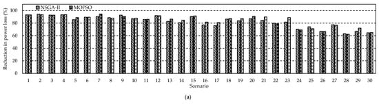 In this paper, a bilevel multi-objective optimization problem is formulated for HC maximization while considering network losses. The objective function in this work is twofold, including the upper- and the lower-level optimization approaches. On the one hand, the upper-level optimization problem in Equation (28) is formulated as a multi-objective optimization problem to maximize the probabilistic hosting capacity () of DGs expressed in Equation (25), and also maximize the total power loss reduction () expressed in Equation (27). On the other hand, the lower-level optimization approach takes place using the DNR mathematical algorithm to choose the appropriate configuration providing a better reduction in the power loss; thus, the objective function at this level is Equation (25). The pseudo-code for the proposed stochastic optimization approach is provided in Algorithm 1.