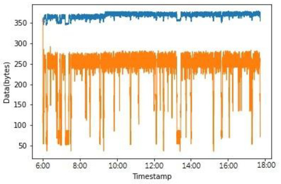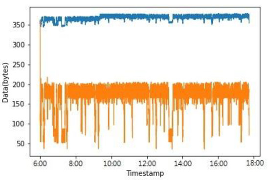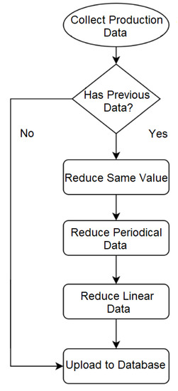 The experiment in this paper used an industrial personal computer to grab production data, such as the current production capacity, the volume of produced bottles, the volume of broken bottles, the total volume of produced bottles, the temperature of preforms and the pressure from the controller, and uploaded these data to a server. The results are shown in Figure 8, where the X axis is the time of data collection and the Y axis shows the size of the uploaded data. The total data collection time was eight hours; it is the same as the average production time of the factory. The dotted blue line is the original data length, and the spotted green line is the uploaded data length, which uses the first method proposed in this paper. For the first set of uploaded data in the figure, all of the values were uploaded, because there were no previous data to use to decide which values could be reduced. After the first set of data, previous data were available for comparison. Thus, it was possible to reduce some values by the algorithm. As Table 1 shows, using only the first method makes it possible to reduce the uploaded data length by 36.47%. As Figure 9 and Table 2 show, if both method I and method II are used at the same time, the data length can be reduced by about 54.57% for each set of data.