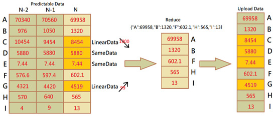 The Smart Machinery Monitoring System includes two methods to reduce the volume of data being uploaded to the monitoring platform. The first method is comparing the latest data with the previous data. If the difference exceeds the tolerance value, the latest data will be uploaded, and vice versa, as shown in Figure 1. The second method can decide whether data should be uploaded to reduce the amount of uploaded data. As shown in Figure 2, the values of C, D, E and G in the latest data are related to the previous data. The C value has a linearly decreasing correlation, the G value has a linearly increasing correlation and the D and E values are the same as the previous D and E values. The changes in these values are the same as the rules of record, so these values will not be uploaded. The remaining values, which are not related to the previous data, will be uploaded packed in JavaScript Object Notation (JSON) format. If the cloud server database does not receive the value of a parameter, it will automatically add the value according to the rules. When the cloud server receives the upload request, the system will retrieve the two most recent pieces of data from the database to calculate the slope (rules of record). The system uses the linear interpolation method to fill in missing values and adds them to the cloud server database.