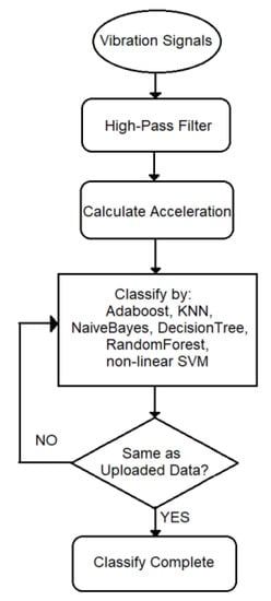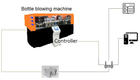 The system architecture of the experimental environment is shown in Figure 7. The machine is a blow molding machine. The production data were recorded by the controller installed in the machine, which grabs the data of all of the sensors in this machine. There was an industrial personal computer connected to the controller via Ethernet, which grabbed production data periodically or monitored some parameters from the controller. The data were uploaded to the monitoring platform if the values of these parameters changed. In addition, there was also an accelerometer installed above the molding module of the machine which was set horizontally relative to the direction of the sliding rail. The grabber loaded the signal from the accelerometer through the wire. The industrial personal computer grabbed the data from the grabber via Ethernet, filtered the data by high-pass filter and calculated the instant acceleration value. The values collected every 3 s need to be predicted and classified by the machine-learning classifier. The prediction result from the classifier was uploaded to the cloud platform and compared with the machine status data stored in the cloud platform. The prediction result was sent to the sample data for the classifier to train again if it was different from the machine status data. If there are too many differences between the prediction results and the machine status data, the system will notify the manager that the production status is different from the parameter settings of the controller.