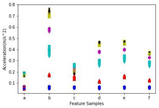 As shown in Figure 3, the vibration values of the machine will be filtered by a high-pass filter to grab the high-frequency acceleration values. Due to the fact that the machine analyzed in this paper has a cycle time of three seconds, the samples were calculated from the average value of the first and second seconds, the average value of the second and third seconds and the average of all three seconds after the acceleration values of a cycle time were collected. As shown in Figure 4 on the X axis, label a is the value of the first second, label b is the value of the second second, label c is the value of the third second, label d is the average value of the first and second seconds, label e is the average value of the second and third seconds and label f is the average value of all three seconds. The Y axis represents the acceleration value. There are six classified traits, including standby, idle, operation I, operation II, operation III and operation IV, as Figure 4 shows. After collecting the six traits and types of labels, the proposed system uses machine learning to classify the operating status. The system calculates the distance vector between all of the samples and the characteristics of each different classifier. It arranges these in order, calculates individual probabilities, builds a vector space, grabs the nearest sample point to a vote, makes a dividing line according to the sample distance or a branch according to the conditions and finally trains six models of six classifiers.
