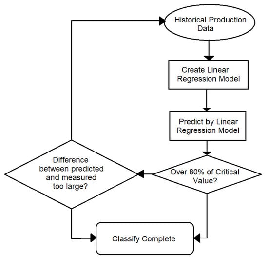 There are several sensors added to the key components of a machine in order to monitor its status. The values of the current, voltage, torque, temperature and time of switch of the machine are monitored, preventing these values from going over the limits of the machine and causing the machine to halt. As Figure 5 shows, the method proposed in this paper uses linear regression to predict the time to inspect or perform maintenance on the machine. Some important values that are suitable to be collected correspond to critical components. For instance, rotation speed or current is suitable for monitoring fans, current or torque is suitable for monitoring a servo, the relationship between current and temperature or time is suitable for monitoring a heater and the pressure or time of grab and release is suitable for monitoring a gripper. Figure 6 shows a linear regression model created using grab time (Y axis) and release (X axis). The method compares the latest collected times of grab and release with the predicted values. The system will notify the manager to check or perform maintenance on the machine when the difference between the collected values and the predicted values is too large.