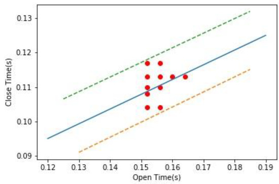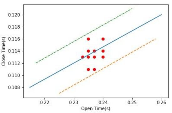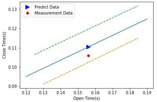 The grabber was driven by the gas pressure controlled by the solenoid valve in the blow molding machine. The condition of the O rings and pistons in the solenoid valve affected the motion of the grabber due to the lack of air pressure. If the sum of the opening or closing time was over 0.5 s, the machine was unable to initiate production. In this situation, the controller will halt the machine and generate an error signal. The data used in this experiment were the opening and closing times of the grabber. In total, 1000 opening and closing times from the historical production data saved in the server were used in this experiment. Figure 12 shows the results where X and Y represent the trait samples used to filter the same traits of samples and train the linear regression model. The formula Y = X × 0.43396226 + 0.04321132 is the result of the training. As Figure 13 shows, when the grabber opening time was 0.153 s, the measured closing time was 0.102 s and the predicted closing time was 0.11 s. This experiment proves that the model is able to predict the closing time of the grabber accurately. The proposed system will notify the manager to give the machine an inspection or maintenance under the conditions where the difference between the predicted and measured times is too large or both of these times are over 80% of the critical value.