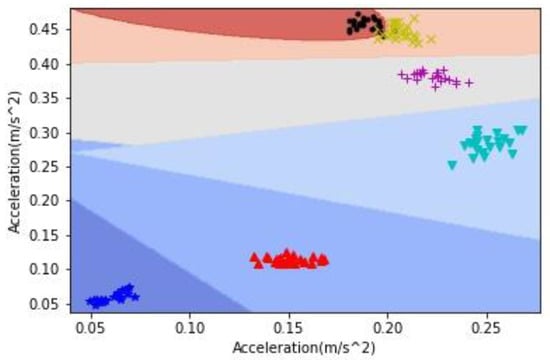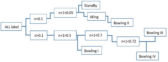 The decision tree classifier performed multiple conditional judgments on the data and separated the data. It started with a conditional assignment from the beginning to separate the data belonging to the same label. Among the remaining data, it used another condition to separate the data belonging to another label. Then, it continued to allocate and divide the remaining data until all the data were in the same label group. Finally, these conditions were unified to get a decision tree model. As shown in Figure 10, first, it took the first second as the data. It separated StandBy/Idling and Bowling I/II/III/IV with 0.1 m/s as the condition. It took the second second as the data and classified it as StandBy when it was less than 0.05 m/s, Idling when it was greater than 0.05 m/s, Bowling I when it was greater than 0.05 m/s and less than 0.5 m/s, Bowling II when it was greater than 0.5 m/s and less than 0.7 m/s, Bowling III when it was greater than 0.7 m/s and less than 0.72 m/s and Bowling IV when it was greater than 0.72 m/s. Random Forest is a more advanced decision tree classifier that is composed of multiple decision trees. The Random Forest classifier uses multiple decision trees to vote to find the best result. Synthesizing a strong classifier through multiple weak classifiers is similar to Adaboost. However, Random Forest does not allocate weights, which means that every decision tree classifier has the same weight. A support vector machine classifier finds the dividing line with the largest interval. As shown in Figure 11, it found the curve separating different labels in the eigenspace formed by the data eigen. After finding the curve, it compared all the labels on both sides of the dividing line to find the dividing line with the largest distance from all the labels. This dividing line is the model of the Support Vector Machine (SVM). As shown in Table 7, decision tree is the least accurate classifier, which has a 90% chance of correct prediction. The Random Forest is 93% accurate, as are KNN and Naive Bayes. The Adaboost has a 96% chance of correct prediction. The best classifier is nonlinear SVM, which has a 98% chance of correctly predicting the operating status.