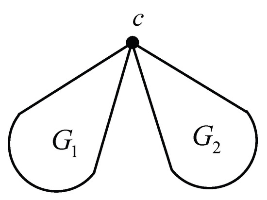 Let graph be obtained from and with the unique common vertex c (see Figure 1), with the vertex weight function for and the edge weight function for . Then