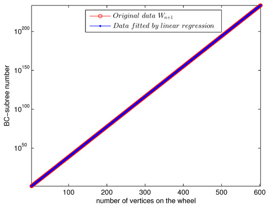 From Corollary 4 we can obtain data of similar nature for . Figure 4 confirms the simple fact that the BC-subtree numbers of increase very fast. The asymptotic expression of the BC-subtree number of seems to be . This is something that can be further verified through analytic combinatorics approaches.
